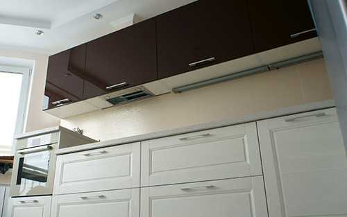 Довольно часто пластиковые короба укладываются просто над кухонными шкафами. В данном случае они смотрятся значительно лучше по сравнению с гофрированными трубами, которые со временем покрываются слоем жира и грязи и очень плохо моются. За пластиковыми же коробами легко ухаживать, они имеют аккуратный и привлекательный вид и не портят интерьер кухни. Недостатки данных изделий — высокая стоимость и сложность установки.