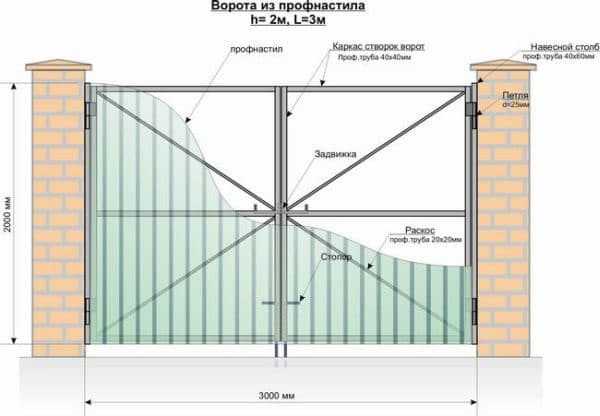 Чтобы правильно рассчитать расход материала, следует провести замеры участка и создать схематический проект ворот. На чертеже отображаются следующие параметры: