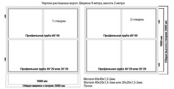 - Каркас ворот монтируется из трубы 60*40 мм или 40*20 мм. Выбор зависит от длины створок и ветровых нагрузок.