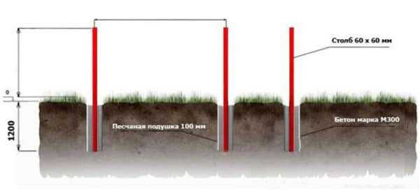 На дно лунки укладывается дренажный слой, который состоит из песка, толщиной 10 см, и гравия средней фиксации, толщиной 5 см. Бетонировать столбики необходимо по определённому порядку: