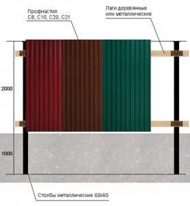 - Обшивка выполняется стеновым профнастилом С8 или С10 – материал обеспечивает жесткость ограждения.