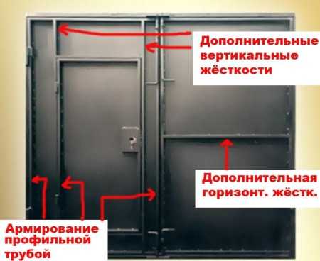 - Каркас гаражных ворот сваривают из уголка, дополнительно скрепляя конструкцию арматурой, приваренной по диагонали, или уголками из листового металла. Петли к воротам крепят сваркой. Чтобы створки ворот не выгибало, можно усилить каркас деревянными брусками. Обшивают ворота с внешней стороны листовым металлом, приваривая его к каркасу.