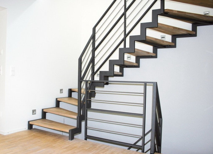 С точки зрения производства, это более сложный вид каркаса лестницы в частном доме на втором этаже – ступени прикрепляются к боковым граням наклонной продольной металлической балки. Основа металлокаркаса- швеллер или листовая прочная сталь, раскроенная на станке плазменной или лазерной резки. Тем не менее, эту модель часто предпочитают мастера, задумываясь об изготовлении лестниц на второй этаж своими руками.