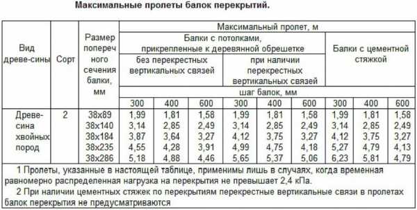 Исходя из этой нагрузки, составлена таблица, представленная ниже. В ней указаны размеры несущих элементов с учетом расстояния на котором они установлены и длины пролета.