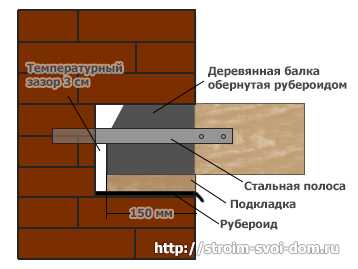 Брусья укладывают с одинаковым шагом по всему периметру, строго параллельно. Перед укладкой их обрабатывают антисептическими пропитками и обматывают в 2-3 слоя рубероидом. Для кирпичных и блочных построек балки перекрытия с концов промазывают битумом. Такой прием защищает древесину от влаги. Для стен толщиной от 2.5 кирпича оставляют продушины для вентиляции. А на месте соединения древесины со стенами под балки стелют рубероид.