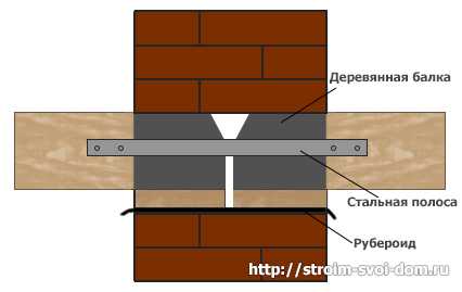 Если балки опираются на внутреннюю несущую стену, то конструкция аналогична предыдущей, с той лишь разницей, что балки перекрытия соединяются друг с другом при помощи металлической ленты. Более наглядно всю схему можно увидеть на рисунке.