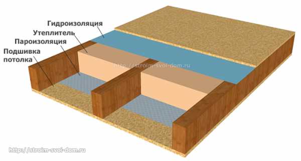 Чердачное перекрытие делается по следующей схеме: на балки перекрытия снизу подшиваются пароизоляция, после которой набиваются доски, вагонка, плиты ОСБ или другое покрытие. Далее укладывается утеплитель нужной толщины.