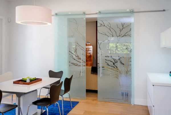 Двери из стекла не обязательно прозрачные. Могут использоваться такие приемы, как оклеивание декоративной пленкой, пескоструйная обработка, сатинирование, горячее эмалирование, гравировка и даже создание наплывов из цветного стекла.