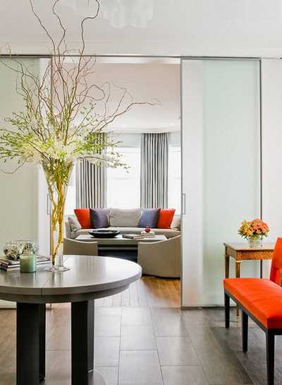Раздвижные двери сегодня только набирают популярность. Это знакомая многим конструкция «купе», она идеальна для небольших помещений. Такие двери не займут много места в малогабаритной квартире, а в сочетании с другими элементами интерьера привнесут в помещение нотку загадочности, уюта и роскоши. Особого внимания заслуживают радиусные (изогнутые) и маятниковые двери – открывающиеся в обе стороны. Они считаются новейшими изобретениями, а потому смогут дополнить любой современный интерьер. Недостаток первых двух видов состоит в том, что за такими дверьми нельзя скрыть противоположную сторону комнаты. А вот двери со специальной системой регулировки уровня прозрачности позволяют при необходимости сделать дверь абсолютно прозрачной или, наоборот, непрозрачной.