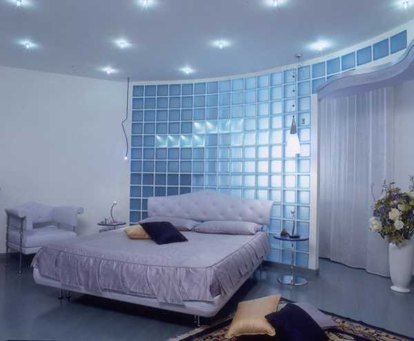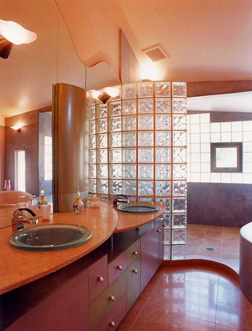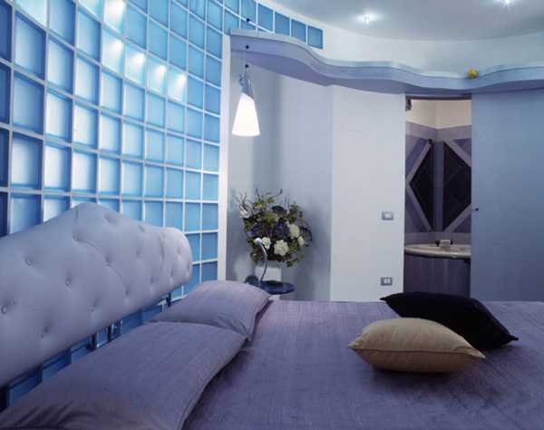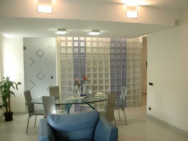 При использовании блоков из стекла для перегородок можно самостоятельно регулировать интенсивность поступающего в помещение светового потока. Обычно перегородку из стеклянных блоков устанавливают в ванной комнате, санузле, кухне либо применяют для зонирования квартиры на несколько помещений. Чаще всего разделяют такие комнаты, как спальню и гостиную.