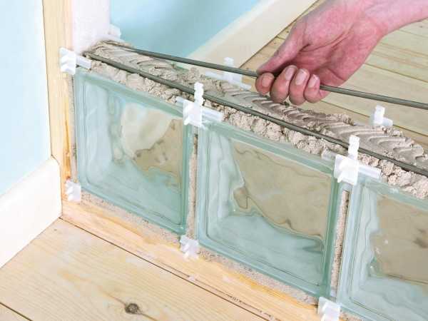 Пластиковые крестики упростят кладку стеклоблока, а арматура сделает конструкцию прочнее.