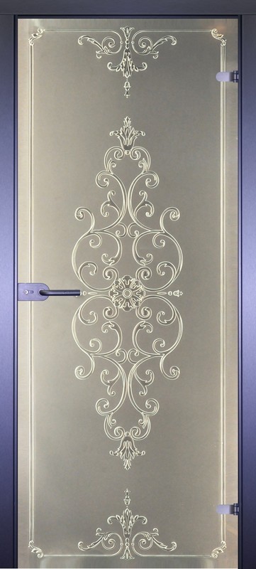 Дверь — одностворчатая. Стекло — каленое 12 мм. Тип стекла — обычное. Цвет — цветное в массе. Матирование — механическим способом. Рисунок — трафарет.
