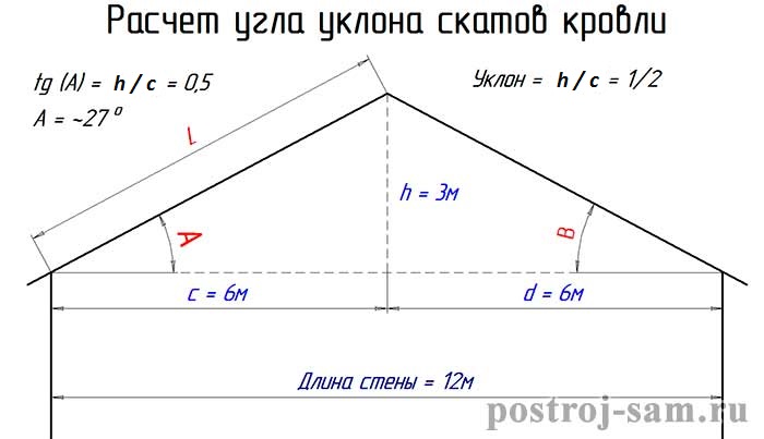 Определение! Углом уклона ската называют угол между ним и горизонтальной поверхностью. Эта величина может измеряться в градусах или в %. Параметр в % равен отношению вертикального катета прямоугольного треугольника, образованного одним скатом и горизонтальной поверхностью, к горизонтальному катету.