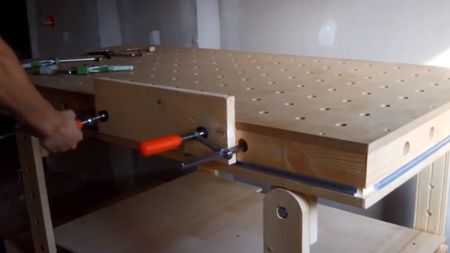 1. Начнем с раскладного стола, который станет отличным помощником в маленькой мастерской. Поможет сэкономить и так небольшую площадь. В столе предусмотрен отсек для всякой мелочевки. Полка, на которые можно разложить необходимый инструмент. Благодаря большому количество отверстий с помощью струбцины можно удобно и быстро фиксировать обрабатываемые заготовки. В них вставляются упоры. Удобно фиксировать детали в вертикальном положении. Если вставить в направляющие болты, то получим дополнительные упор. Имея набор струбцин и такой стол, можно комфортно выполнять разнообразные работы.