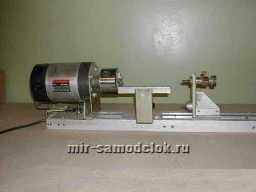 - Когда указанные выше работы завершены, все детали соединяют в одно целое, после чего осуществляется первый пуск. Для этого заготовку устанавливают в промежутке от задней оси опоры к оправке. При этом опора должна быть придвинута так, чтобы ее иглы зашли в заготовку. После этого можно подключить электродвигатель к сети и производить обработку заготовки резцом (или его аналогом).