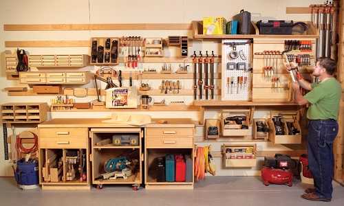 В любой мастерской, где живет дух творчества и изобретательства, частой проблемой становится беспорядок. Он вызван большим количеством предметов, которые находятся не на своих местах, а часто даже и не имеют своего места. Поэтому мастерская должна быть оборудована соответствующим образом. Там, как правило, есть рабочая зона и зона хранения всевозможных приспособлений. Сделать верстак и стеллажи для инвентаря и инструмента можно своими руками. И этим заняться нужно в первую очередь.