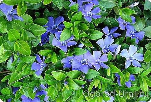 - подходит для сада в сибирской местности и барвинок. Цветение этого растения-вьюна продолжается на протяжении всего теплого сезона; оно наполняет сад голубоватыми и розовыми красками. Барвинок стелется по земле подобно ковру. Это растение можно сажать как в теневой, так и в солнечной зоне;