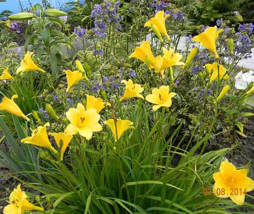 Лилейник — очень неприхотливое и выносливое растение до 1 м высоты, выдерживает полутень, не страдает от засухи и сорняков. Разные виды цветут с июня до августа.