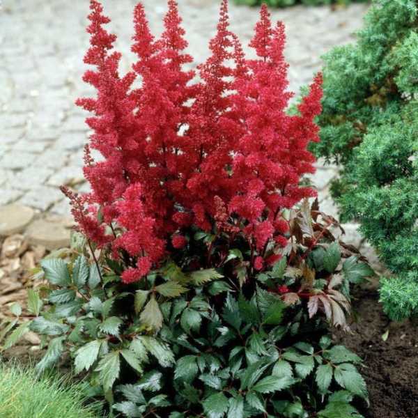 В зависимости от сорта и вида высота растений колеблется от 40 до 120 см. Астильба любима садоводами за неприхотливость, морозостойкость и обильное длительное цветение. Астильба может расти в тени, ее выращивают на влажных и даже заболоченных местах, по берегам водоемов. В садовых посадках эти красивые и неприхотливые цветы для дачи великолепно выглядят на фоне хвойных пород, и сами будет роскошной рамой для низкорослых растений.
