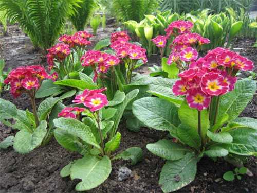 Примулы. Небольшое растение с выразительными цветами и крупными листьями. Высаживается в любом месте.