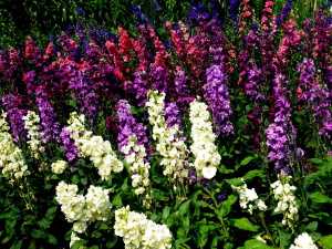 В конце июня на смену низкорослым флоксам спешат метельчатые. Их пышные кусты с крупными соцветиями всевозможных оттенков — от белого до тёмно-фиолетового — цветут всё лето, а иногда и в начале осени.