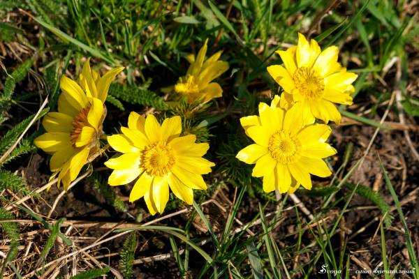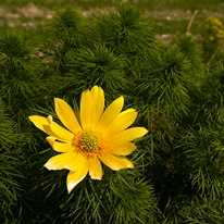 - Адонис. Многолетнее растение семейства лютиковых высотой до 50 см имеет развлетвенный стебель, множество узких листьев с пальчиковыми дольками. Его пышные, но невысокие кустики во время цветения покрываются красными или ярко-желтыми одиночными цветками, похожими на полевые ромашки (см. фото). Диаметр цветов с глянцевыми лепестками редко достигает 6-7 см. Адонис предпочитает расти на солнечных местах, любит плодородные почвы, высокую влажность. Плохо переносит пересадки, размножается семенами.