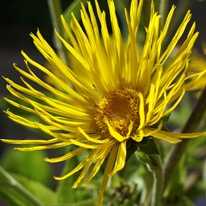 Девясил — мощное декоративное растение орнаментального плана с огромными прикорневыми листьями и крупными корзинками лучистых желтых цветков — цветет в июле. Эти растения заднего плана уместны на больших участках, где в одиночных группах хорошо смотрятся на газоне.