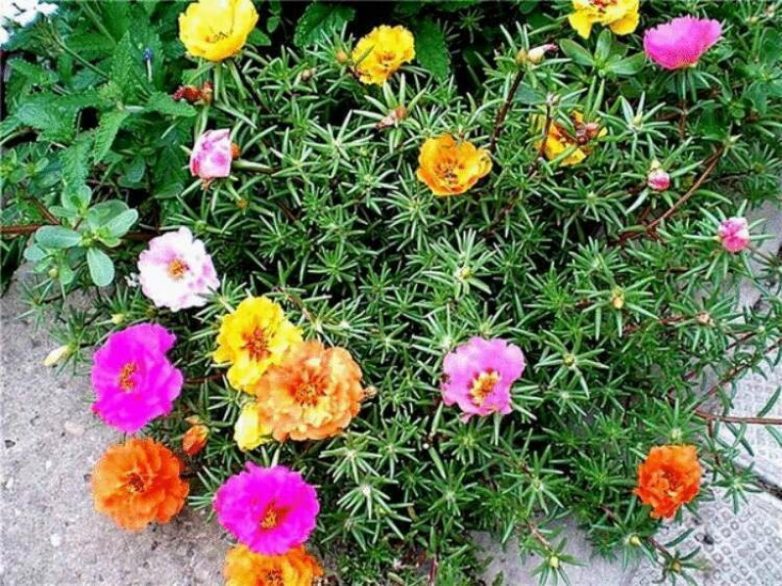 Портулак поражает пестротой и яркостью цветов: желтые, белые, оранжевые, красные. Стебли с листочками похожи на еловые иголки. Цветет с июня по сентябрь. Он любит солнце и жару, не требует частый полив.