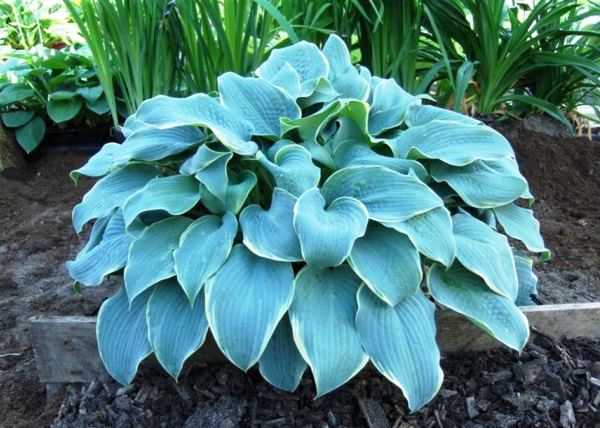 Для оформления бордюрных зон подойдет и многолетняя хоста. Это растение вообще является довольно популярным в ландшафтном дизайне, поскольку даже тогда, когда не цветет, оно привлекает внимание своими широкими листьями темно- и светло-зеленого оттенка. А некоторые разновидности хост имеют и яркую листву.