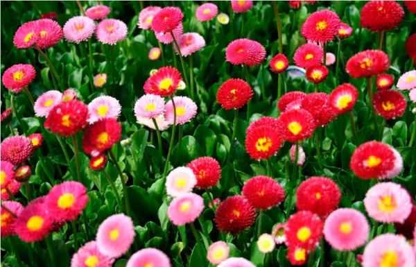 - маргаритки – менее устойчивый к погодным условиям вариант растений. Их цикл цветения аналогичен фиалкам, а затем они насеиваются сами собой. В зависимости от температур, маргаритки могут зацвести в мае-июне или позже. Украшают сад розовым, белым и красноватым цветением;