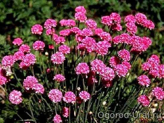 - Армерия приморская — выносливый многолетний цветок, устойчивый к суровым зимам. Растёт в высоту до 20 см. Армерией украшают клумбы, альпийские горки и высаживают, как невысокую живую изгородь, чтобы выделить дорожки или отдельные элементы.