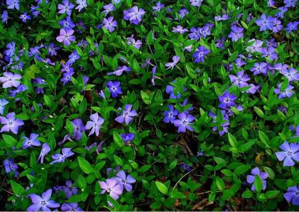 - Барвинок — популярный красивый многолетник нежно-розового или голубого цвета. Период цветения длится с июня до середины сентября. Цветки барвинка стелются ковром, поэтому являются украшением любой композиции. Отлично растут как на солнечной стороне, так и в тени.