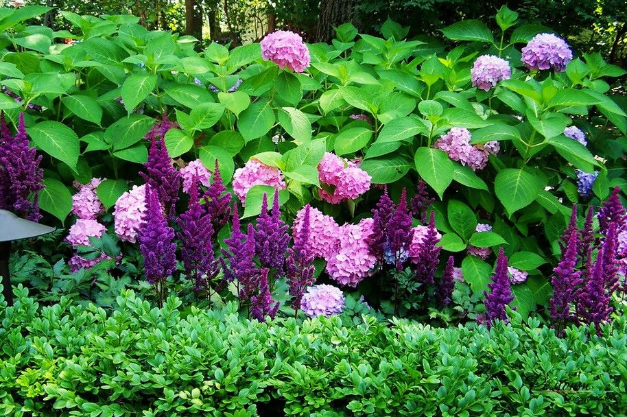 Это неприхотливое растение будет красиво и пышно цвести даже в тени. Но для этого астильбу следует хорошо поливать. Зацветает культура в июле и радует своими яркими вытянутыми соцветиями на протяжении 10 недель.