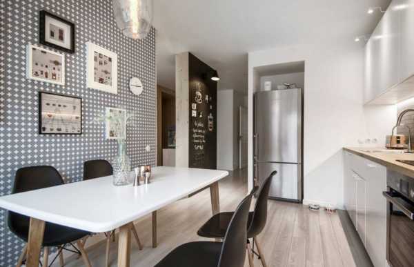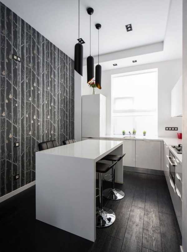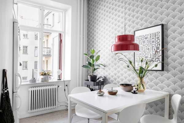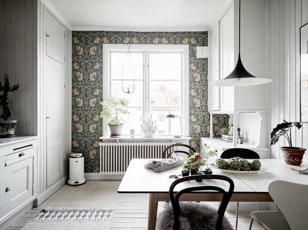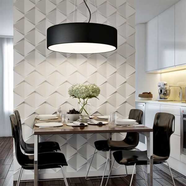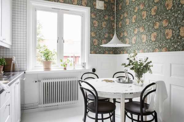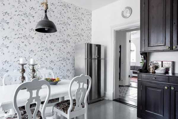 От темных оттенков для обоев стоит отказаться, но это не значит, что нужно останавливаться на белых. Абсолютная белизна будет давить на хозяев и гостей кухни. Светлые обои с темным рисунком будут смотреться более выигрышно.