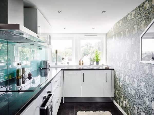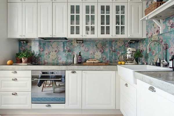 Обои можно использовать для декора фартука, если закрыть их прозрачной панелью из закаленного стекла