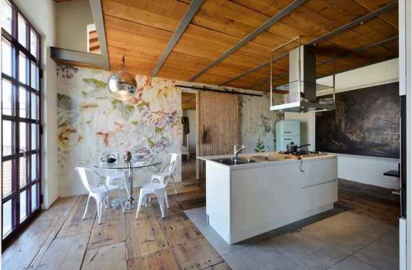 Рабочая зона и одна из стен могут быть выполнены в одной стилистике. Для оформления фартука обычно используют кафельную плитку – вы с легкостью сможете подобрать фотообои в тон рисунку на плитке, а стены оформить в классическом стиле. Отделка стен также должна соответствовать покрытию пола. Если пол выполнен под дерево, добавьте в оформление стен что-то деревянное, например, кухонный гарнитур или фартук в рабочей зоне.