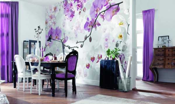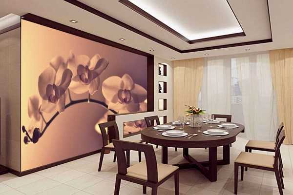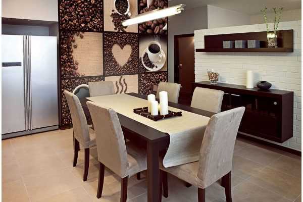 - при выборе крупного рисунка лучше оклеить такими обоями одну самую большую стену, где, как правило, будет стоять обеденный стол;