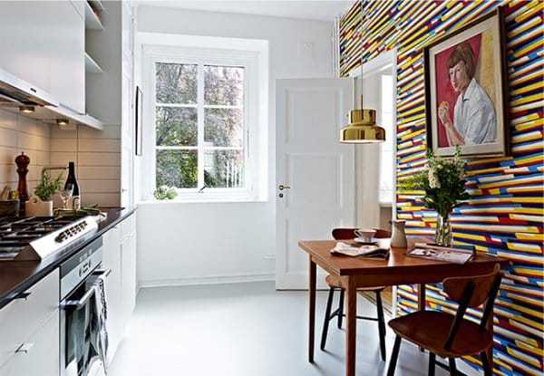 - не используйте в маленькой комнате фотообои во всю стену, лучше будет смотреться яркий акцент над столом в общей стилистике с фартуком в рабочей зоне.
