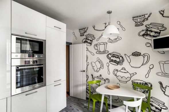 Новинкой 2018 и 2019 годах стал дизайн кухни, включающий обои с изображением фруктов и овощей, специй, тарелок, чашек и различной утвари. Такие обои подходят по целевому назначению помещения, добавляют яркости и свежести.