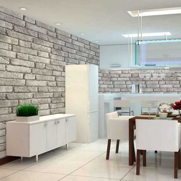 На фото модных и современных интерьеров кухни 2018-2019 года можно увидеть широкое разнообразие вариантов оформления помещения и большие дизайнерские возможности в использовании обоев разной фактуры и цвета, в том числе и новинки — комбинированных обоев.