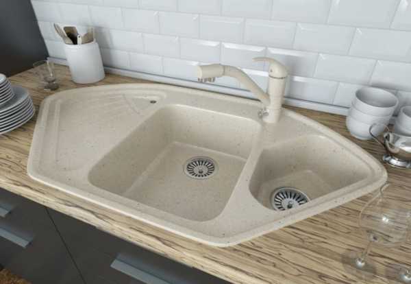 На фото бежевая кухонная мойка из искусственного камня, выполненная в форме трапеции.