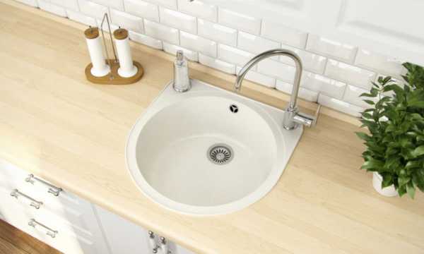 На фото кухонная мойка круглой формы, изготовленная из искусственного камня белого цвета.