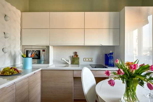 На фото интерьер кухни с накладной мойкой из искусственного камня светлого оттенка.