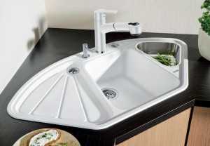 - Мойки с несколькими чашами для расположения в углах. Чаши расположен под углом друг к другу, а пространство между ними используется как дополнительная рабочая поверхность.