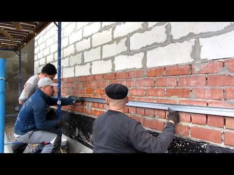 - Подготовить поверхность стен и цокольную часть фундамента. Очистить от грязи, высолов, отслоений, пятен масляной краски. Выровнять и проверить отвесом по вертикали. Технология наклеивания цементными смесями позволяет не грунтовать поверхность.