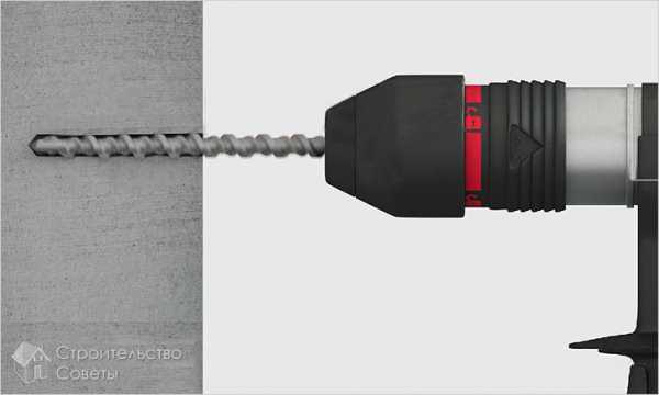 - Отверстия под крепежи сверлятся при помощи перфоратора и бура по бетону. Глубина выставляется из расчета размера дюбеля плюс 20-100 мм.