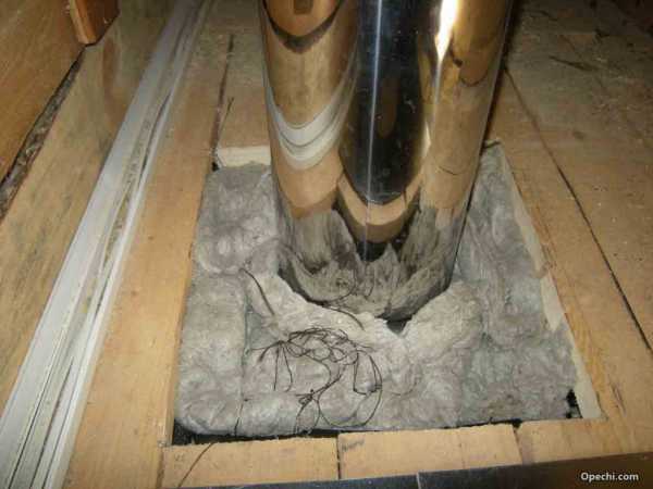 При прохождении дымоходом потолка и крыши, нужно обязательно использовать специальный потолочный проходник. Он представляет из себя металлический короб, либо уже утепленный базальтовой ватой, либо пустотелый, который нужно самостоятельно заполнить керамзитом, песком или другим материалом, имеющим низкую теплопроводность.