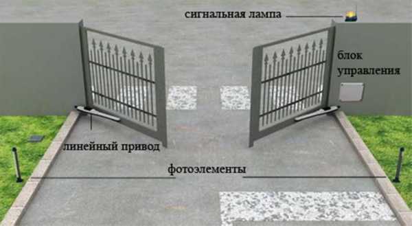 Для данного типа ворот не возникают трудности при монтаже линейных приводов. При установке следует учитывать, что редукторы линейного типа сократят проем распашной конструкции на 15 см с каждой стороны, и устанавливать их лучше высоко, чтобы не задеть транспортом при движении.