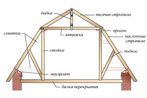 В данном случае опорой для стропильной ноги служит уже не опорный брус, а балка перекрытия. Поэтому появляется необходимость усилить наклонную деталь подкосом. Соединяют стойку и балку перекрытия методом врубки одной в другую примерно на треть высоты горизонтальной балки. В этом случае конструкция крыши делится на отдельные системы висячих и наслонных стропил и, соответственно, так же рассчитывается.