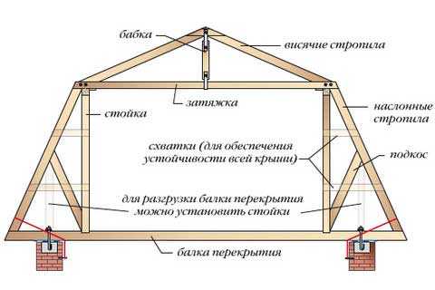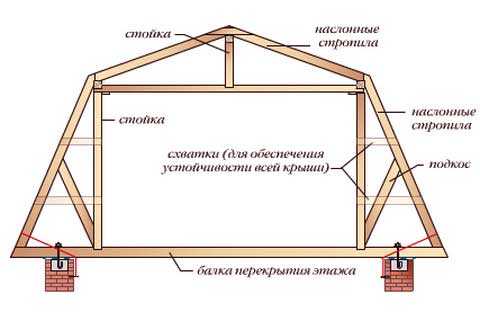 Когда устройство мансардной крыши предполагает возведение дополнительно боковых стен, то меж стропилами и мауэрлатом закрепляют подкос либо стойку.